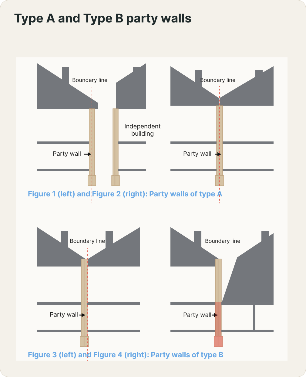 - Type A: a wall that forms part of a building and stands on the land of two or more owners — the classic terraced or semi-detached dividing wall.